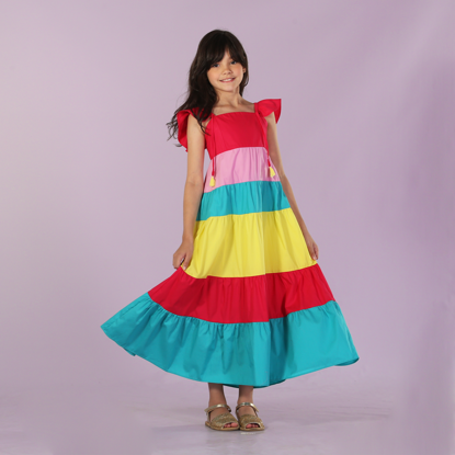 Vestido infantil em tecido de algodão, decote reto, alça com babadinho e detalhe com fita pala alta, decote nas costas com lastex e saia com recortes coloridos abrindo roda, comprimento maxi mídi, confortável e divertido.